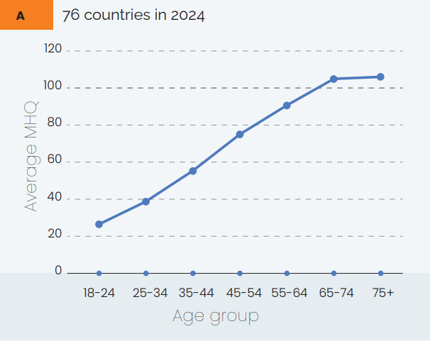 18 - 34 歲族群的「心理健康指數(MHQ)」平均只有 38 分。