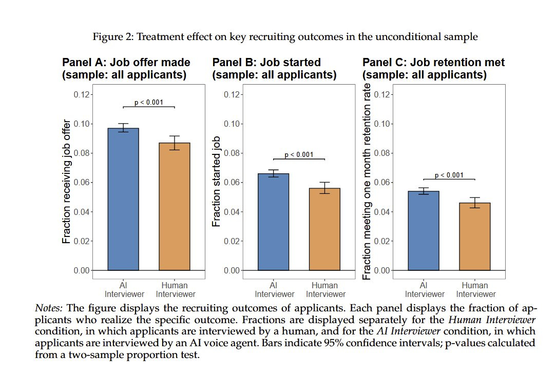 最近一篇研究顯示:在一場針對七萬人的大型招聘實驗中,一半由人類面試官負責,另一半則由 AI 面試官進行。AI 面試官的表現,竟然全面超越了人類!由 AI 面試的求職者,不僅錄取率更高、留任率也更久。更有趣的是,十個求職者裡,有八個更喜歡跟「機器人」聊天!!!