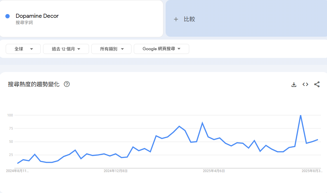 Google Trends 顯示「Dopamine Decor」過去一年搜尋量暴增 280%。TikTok 上相關影片觀看次數破 1000萬,而更大的母趨勢「多巴胺排毒/菜單」觀看量近 1億。這代表市場需求正在井噴,你現在切入,正是浪潮的起點。